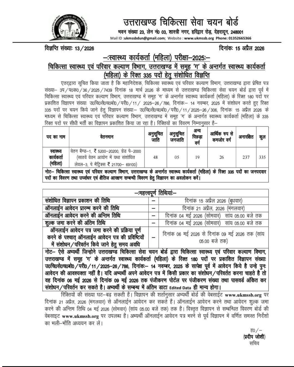 उत्तराखंड चिकित्सा सेवा चयन बोर्ड ने स्वास्थ्य विभाग में महिला स्वास्थ्य कार्यकर्ता के 335 पदों…