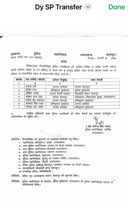 इनके साथ ही 7 पुलिस उपाधीक्षक यानी डीएसपी के तबादले भी किए गए हैं। इनमें अभी तक चंपावत जिले में तैनात वंदना वर्मा को अब देहरादून जिले में नई तैनाती मिली है। अभिसूचना मुख्यालय में तैनात योगेश चंद, पुलिस मुख्यालय ट्रांसफर किए गए हैं। ओशिन जोशी जो अभी तक टिहरी गढ़वाल जिले में तैनात थे, उन्हें सीआईडी सेक्टर देहरादून में नई तैनाती मिली है।