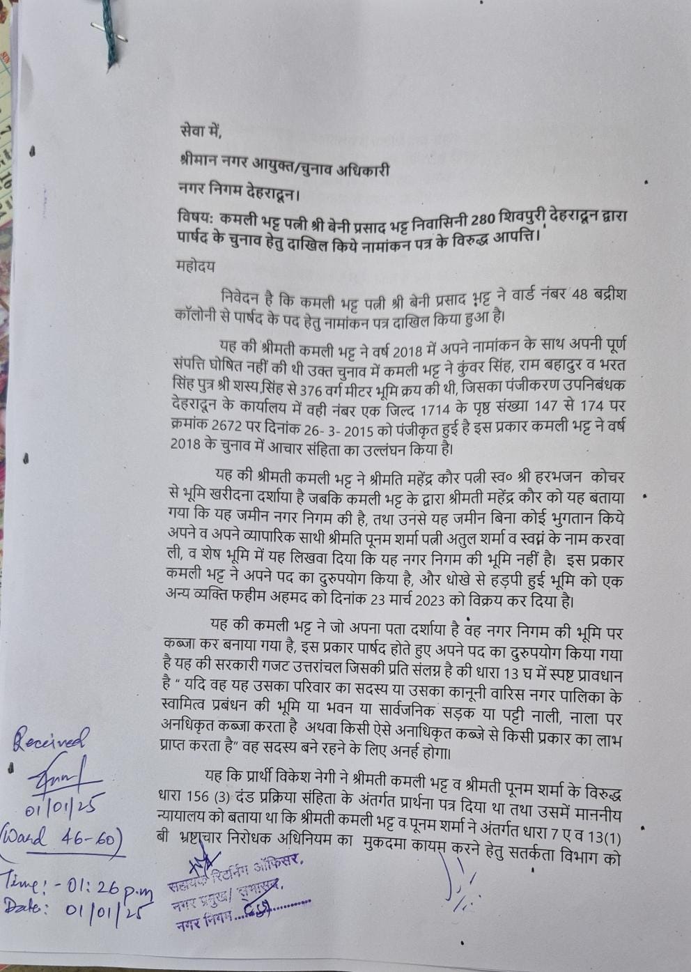 एडवोकेट विकेश नेगी ने निर्वाचन अधिकारी से मांग की है कि कमली भट्ट का नामांकन रद्द किया जाए। निगम चुनाव अधिकारी को आज दी गयी शिकायत में एडवोकेट विकेश नेगी ने कहा कि 2018 में कमली भट्ट ने चुनाव आयोग को जो संपत्ति का विवरण दिया है उसमें साझीदार में 376 वर्ग मीटर की भूमि का उल्लेख छिपा दिया था। यह आदर्श आचार संहिता का उल्लंघन था। कमली भट्ट पार्षद रहते हुए एक अन्य सरकारी भूमि भी पद का दुरुपयोग करते हुए 23 मार्च 2023 को बेच दी थी।