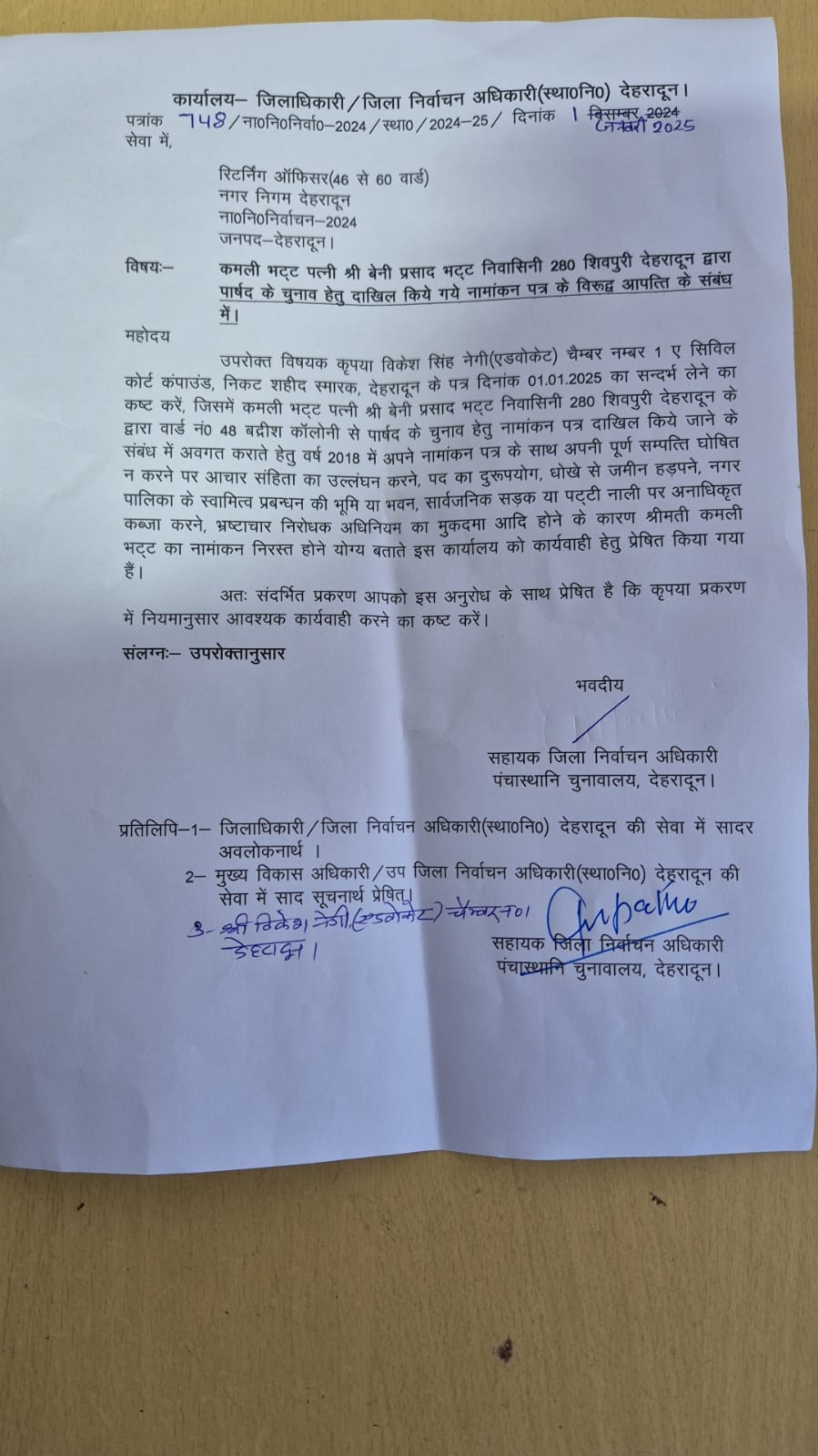 सहायक जिला निर्वाचन अधिकारी ने दिये नियमानुसार कार्रवाई के निर्देश, वार्ड 48 से पार्षद का चुनाव लड़ रही हैं कमली भट्ट