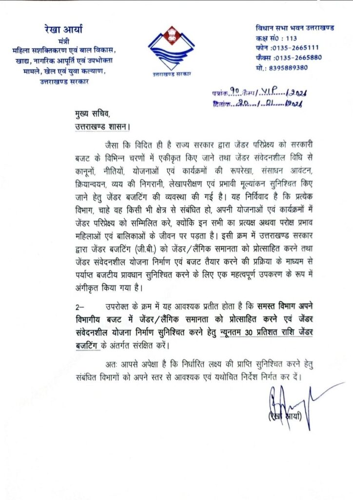 प्रदेश की महिला सशक्तिकरण एवं बाल विकास मंत्री रेखा आर्या ने मुख्य सचिव आनंद बर्धन को पत्र लिखा है। पत्र के जरिए कैबिनेट मंत्री रेखा आर्या ने प्रदेश के बजट का 30 फीसदी हिस्सा महिलाओं के लिए आरक्षित करने का सुझाव दिया है।