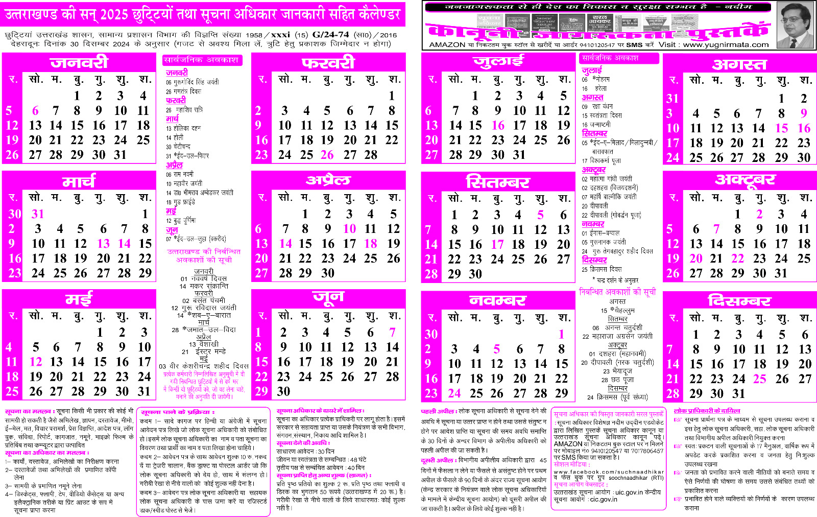 काशीपुर। सूचना अधिकार की नवीन जानकारी अब कैलेंडर के माध्यम से आम जनता को मिल सकेगी। इसके लिये सूचना अधिकार विशेषज्ञ नदीम उद्दीन एडवोकेट द्वारा एक कैलेंडर प्रकाशित कराया गया है। जिसमें 2025 के कैलेंडर के साथ उत्तराखंड सरकार के राजपत्रित व निबंधित अवकाशों की सूची को भी दर्शाया गया है। सूचना अधिकार की सामान्य जानकारी देने वाले नदीम द्वारा प्रकाशित कैलेंडर मेें सूचना का मतलब, सूचना अधिकार का मतलब, सूचना अधिकार के दायरे में शामिल प्राधिकारी, सूचना लेने की प्रक्रिया, सूचना हेतु अतिरिक्त शुल्क, सूचना देने की अवधि, प्रथम व द्वितीय अपील, लोक प्राधिकारियों/विभाग के सूचना अधिकार के अन्तर्गत दायित्व, सूचना अधिकार की विस्तृत जानकारी हेतु पुस्तकें, सोशल मीडिया (फेेस बुक पेज व गु्रप) उत्तराखंड सूचना आयोग तथा केन्द्रीय सूचना आयोग की वेबसाइटों की जानकारी शामिल है।