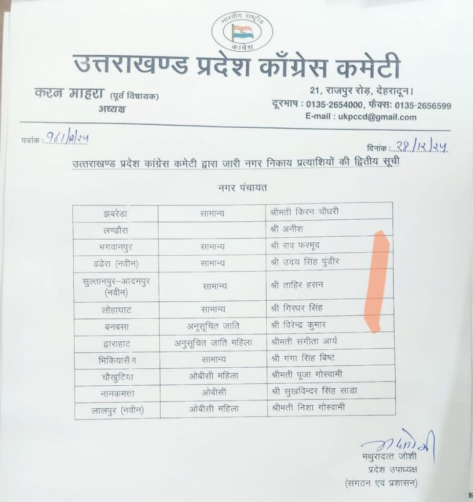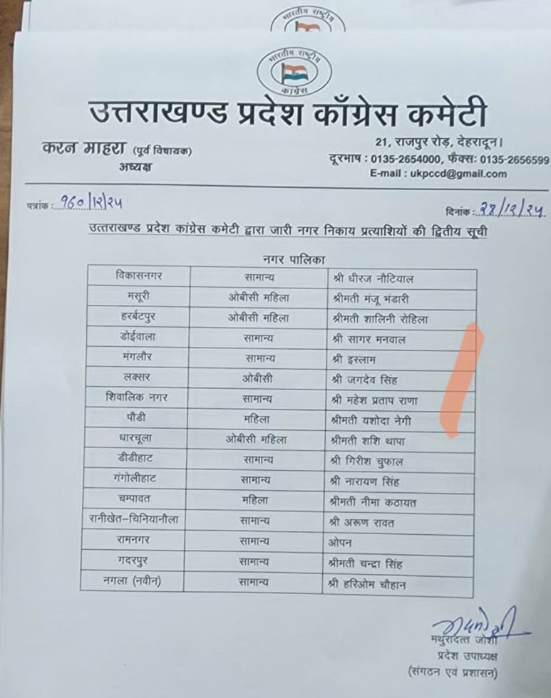 Uncategorized निकाय चुनाव को लेकर कांग्रेस उम्मीदवारों की दूसरी सूची जारी ukDecember 29, 2024May 3, 2025 Spread the loveदेखें सूची देहरादून। कांग्रेस ने निकाय चुनाव को लेकर अपनी एक और सूची जारी की। इस सूची में 16 नगर पालिका और 12 नगर पंचायत के उम्मीदवारों की घोषणा की गई है।
