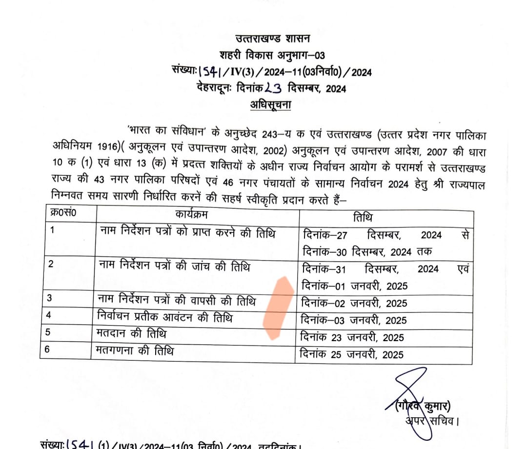 देहरादून। उत्तराखंड नगर निकाय चुनावों की आरक्षण की फाइलन लिस्ट जारी होने के बाद राज्य निर्वाचन आयोग ने चुनावों की तारीख का ऐलान किया है। 27 से 30 दिसंबर के बीच नामांकन किया जाएगा। 31 जनवरी की नामांकन पत्रों की जांच की जाएगी। 2 जनवरी को नाम वापसी की अंतिम तारीख रखी गई है। 23 जनवरी को निकाय चुनाव के लिए वोटिंग होगी। 25 जनवरी को रिजल्ट घोषित किया जाएगा।