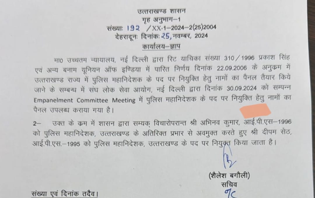 आज यहां जारी आदेश में कहा गया कि अभिनव कुमार, आई.पी.एस-1996 को पुलिस महानिदेशक, उत्तराखण्ड के अतिरिक्त प्रभार से अवमुक्त करते हुए दीपम सेठ, आई.पी.एस.-1995 को पुलिस महानिदेशक, उत्तराखण्ड के पद पर नियुक्त किया जाता है।