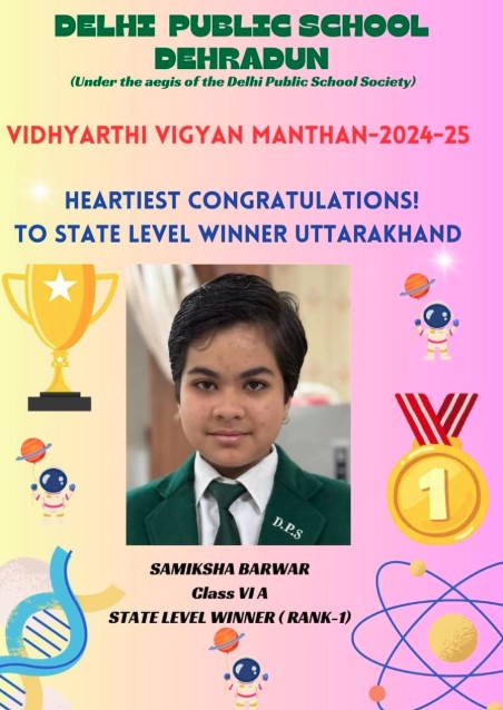 Samiksha Barwar of class 6 from Delhi public school Dehradun bagged school level Rank-1, then District level Rank-1 and also State Level Rank-1 which was organised at Faculty of Engineering and Technical, Gurukula Kangri (Deemed to be University), Haridwar, Uttrakhand on 08th Dec 2024