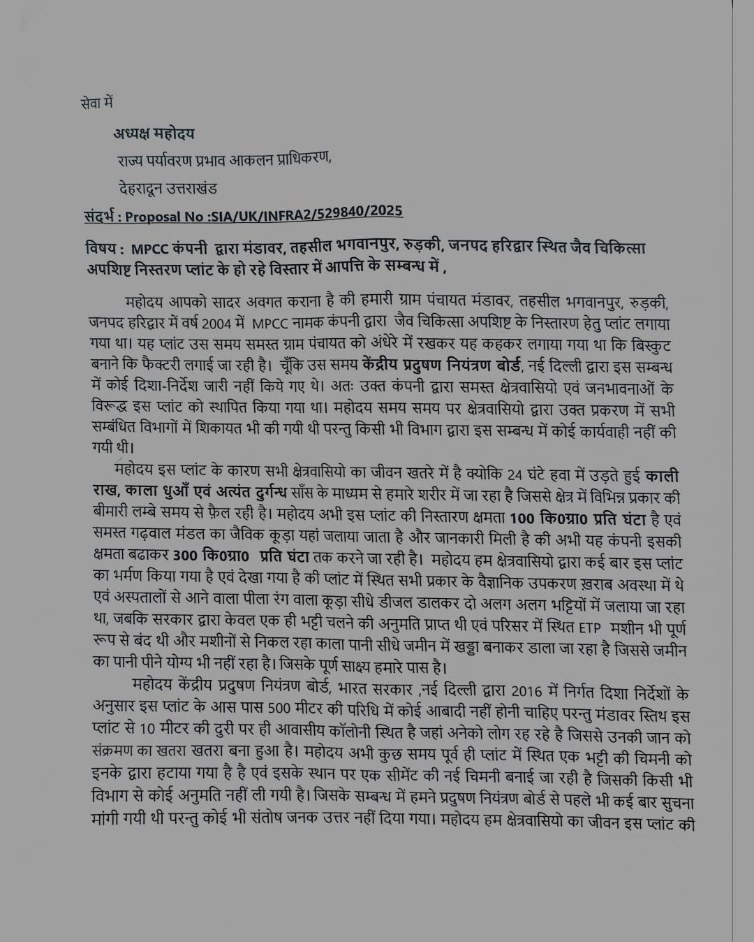 रुड़की/हरिद्वार। हरिद्वार जनपद के ग्राम मण्डावर, तहसील भगवानपुर में स्थित MPCC कंपनी द्वारा संचालित जैव चिकित्सा अपशिष्ट निस्तारण प्लांट एक बार फिर विवादों में घिर गया है। कंपनी द्वारा इस प्लांट की निस्तारण क्षमता 100 किलोग्राम प्रति घंटा से बढ़ाकर 300 किलोग्राम प्रतिघंटा करने के प्रस्ताव के विरोध में समस्त ग्रामवासियों ने राज्य पर्यावरण प्रभाव आकलन प्राधिकरण (SEIAA), उत्तराखंड को कड़ा आपत्ति पत्र सौंपा है।