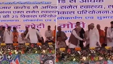 दरभंगा: प्रधानमंत्री नरेंद्र मोदी ने बुधवार को बिहार के दरभंगा में अखिल भारतीय आयुर्विज्ञान संस्थान (AIIMS) की आधारशिला रखी और राज्य में 12,100 करोड़ रुपये की विभिन्न परियोजनाओं का उद्घाटन किया। इस कार्यक्रम के दौरान मुख्यमंत्री नीतीश कुमार का एक वीडियो सोशल मीडिया पर तेजी से वायरल हो गया, जिसमें वे प्रधानमंत्री मोदी के पैर छूने के लिए झुकते हुए दिखाई दिए। हालांकि, PM मोदी ने उन्हें रोकते हुए उनसे हाथ मिलाया। यह इस साल का तीसरा मौका है जब नीतीश कुमार ने PM मोदी के पैर छूने की कोशिश की है।