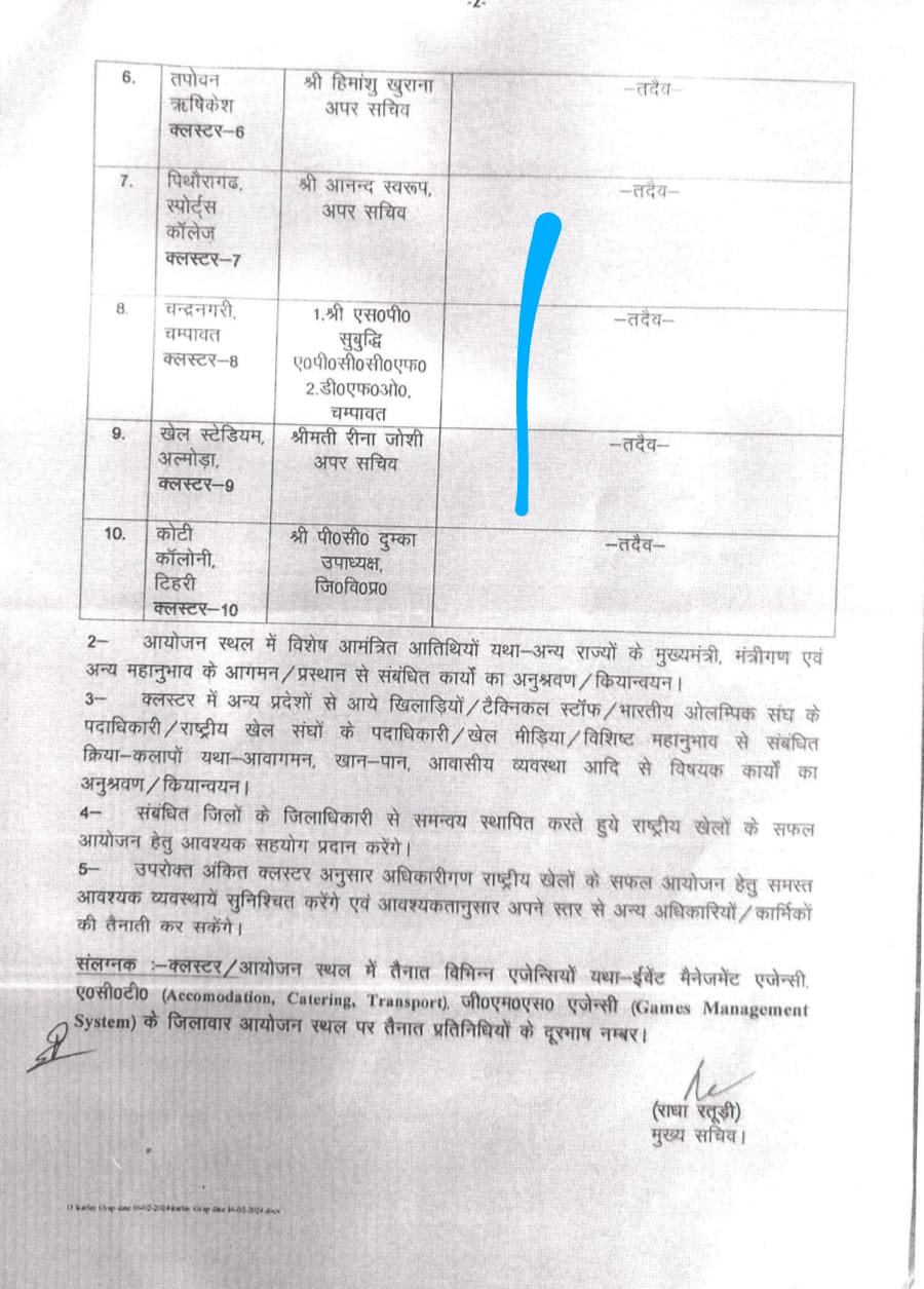 उपरोक्त अंकित क्लस्टर अनुसार अधिकारीगण राष्ट्रीय खेलों के सफल आयोजन हेतु समस्त आवश्यक व्यवस्थायें सुनिश्चित करेंगे एवं आवश्यकतानुसार अपने स्तर से अन्य अधिकारियों/ कार्मिकों की तैनाती कर सकेंगे।