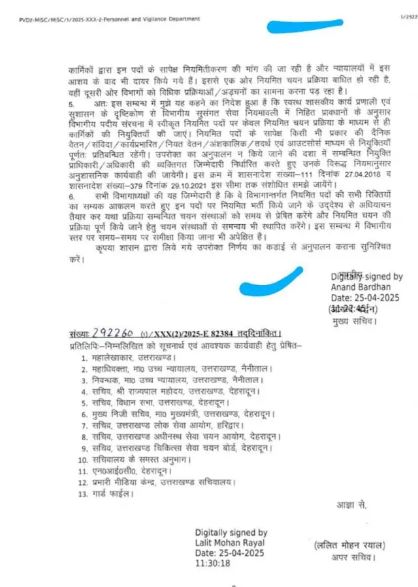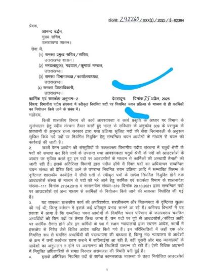 आदेश में कहा गया है कि,बनियमित पदों के सापेक्ष कामचलाऊ व्यवस्था के तहत नियोजित आउटसोर्स कार्मिकों द्वारा इन पदों के सापेक्ष नियमितीकरण की मांग की जा रही है और न्यायालयों में इस आशय के वाद भी दायर किये गये हैं। इससे एक ओर नियमित चयन प्रक्रिया बाधित हो रही है, वहीं दूसरी ओर विभागों को विधिक प्रक्रियाओं/अड़चनों का सामना करना पड़ रहा है।