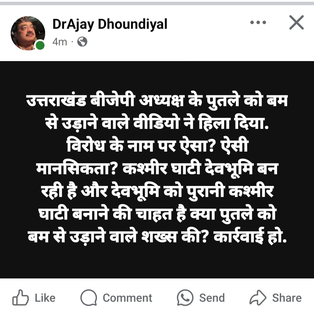 वहीं उत्तराखंड प्रदेश कांग्रेस अध्यक्ष करन माहरा ने भाजपा प्रदेश अध्यक्ष के पुतले को पटाखों से उड़ाते हुए दिखाए गए वायरल वीडियो की कड़ी निंदा करते हुए बयान जारी किया।