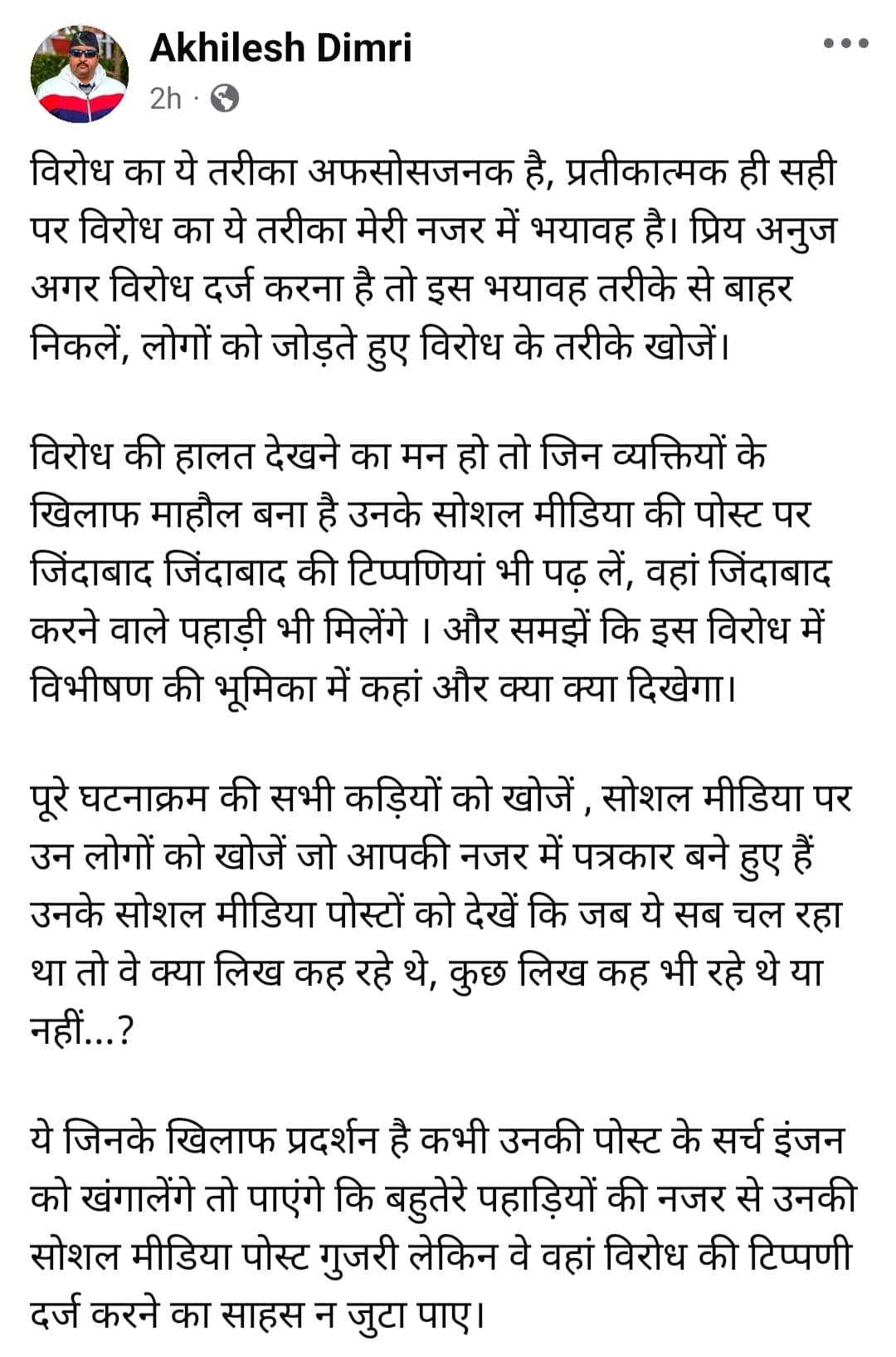 वरिष्ठ पत्रकार अखिलेश डिमरी ने इस घटना को अफसोसजनक करार देते हुए कहा कि विरोध का यह तरीका भयावह है। उन्होंने प्रदर्शनकारियों से अपील की कि वे इस तरह के हिंसक और डरावने तरीकों से बचें और एक तार्किक और निर्णायक विरोध का रास्ता अपनाएं। उन्होंने यह भी कहा कि जो लोग इस तरह के विरोध में शामिल हो रहे हैं, उन्हें यह समझने की जरूरत है कि समाज में ऐसे लोग भी हैं जो इसका समर्थन कर रहे हैं। उन्होंने प्रदर्शनकारियों को सलाह दी कि वे सोशल मीडिया पर उन लोगों की पोस्ट पर भी नजर डालें, जो विरोध के बावजूद मौन हैं, ताकि उन्हें यह समझने में मदद मिल सके कि असली समस्या क्या है।