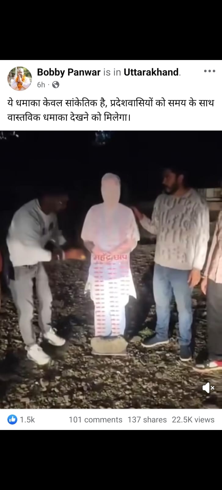देहरादून । उत्तराखंड में भाजपा प्रदेश अध्यक्ष महेंद्र भट्ट के पुतले को पटाखों से उड़ाने का वीडियो सामने आया है। इस घटना ने सोशल मीडिया पर तीखी प्रतिक्रियाओं को जन्म दिया है। लेकिन सबसे ज्यादा चौंकाने वाली बात यह है कि बेरोजगार संघ के अध्यक्ष ने फेसबुक पर पोस्ट लिखते हुए इसे सांकेतिक धमाका बताया और कहा—